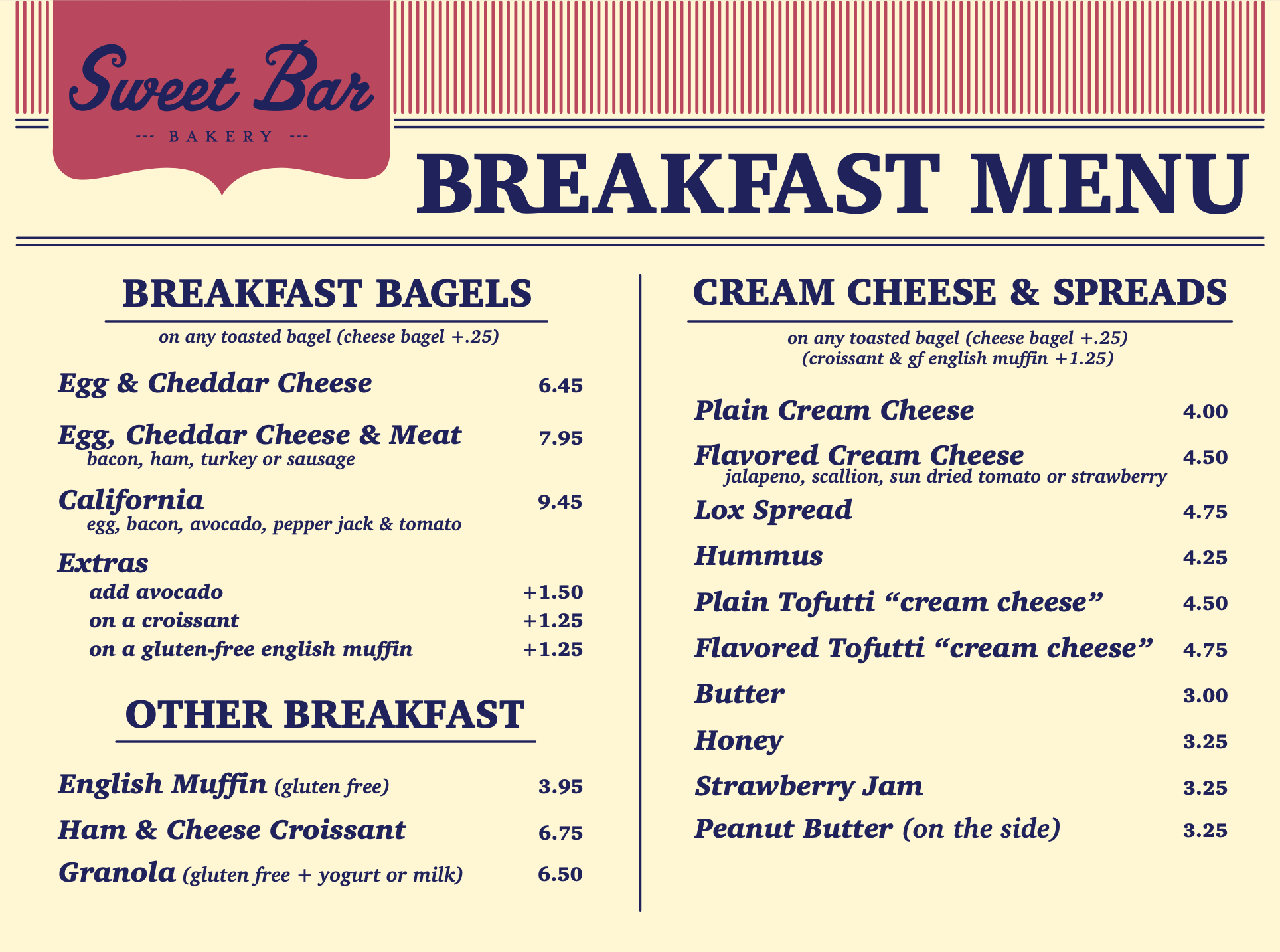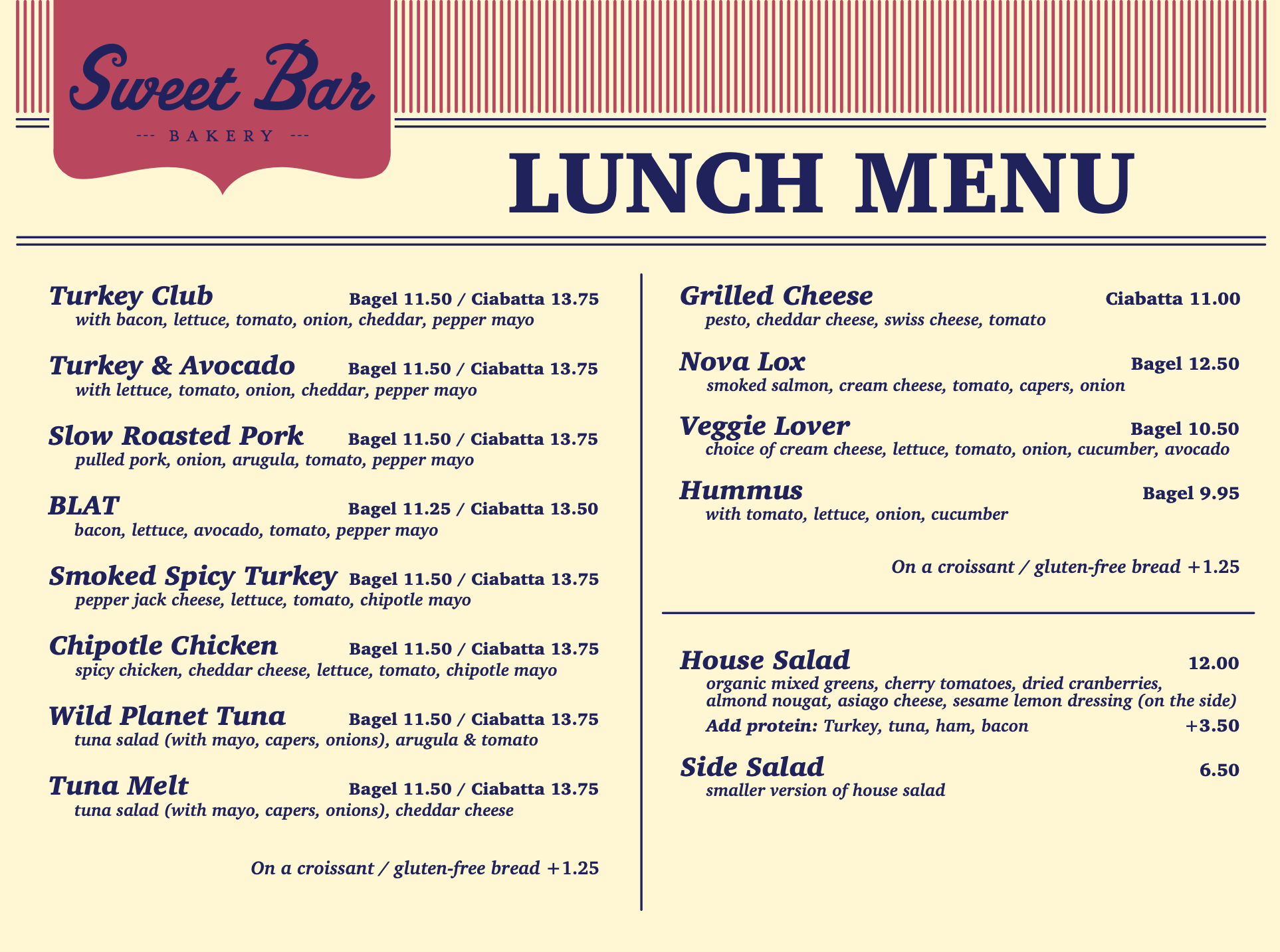 Sweet Bar Bakery is here for each part of your day – wake up with fresh baked artisan pastries and organic, in house-roasted espresso, coffee and tea; lunch on grilled panini, flatbreads, and salad; take an afternoon break with a cupcake and house-made chai. There is indoor seating and stools at the bar, or grab your food on the run – we are here to take care of you!